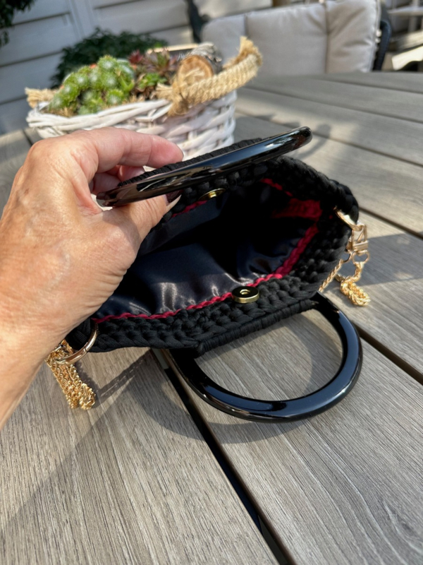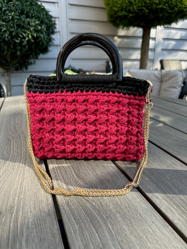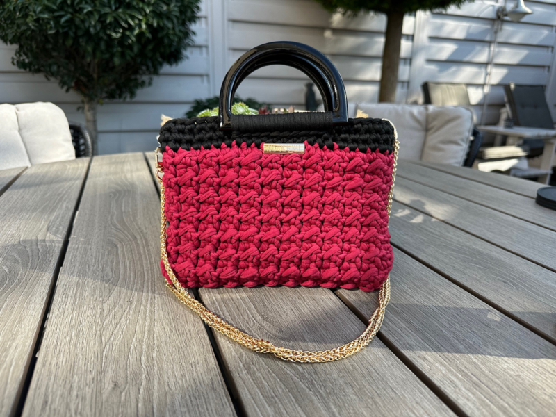 Artikelnummer: Tas138Mooie kleine tas van Ansi Original handmade met donkerrood en zwart Tshirt garen. De tas heeft leuke zwarte acryl handvatten en een lange ketting van 115cm. De tas is 23 cm breed en 18 cm hoo en is gevoerd met een mooie zwarte satijnen stof.